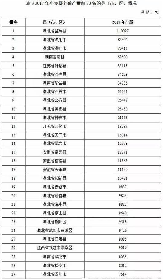 2017年,全国小龙虾养殖产量前30名的县(市、区)中,湖北省20个、湖南省4个、安徽省3个、江苏省2个、江西省1个。30个县(市、区)的小龙虾养殖总产量为73.49万吨,占全国小龙虾养殖总产量的65.05%。其中,湖北省监利县小龙虾产量为11万吨,是唯一产量超过10万吨的县。